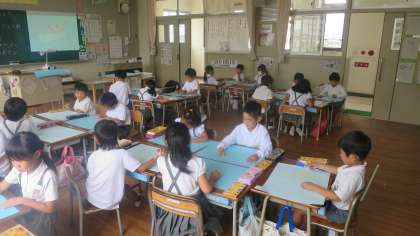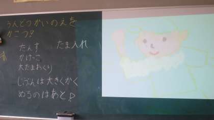 1年生が運動会の思い出の絵を描こうとしていました。まだ説明の段階のときにおじゃましたので、まだ全然描き始めていない状態でしたが、子どもたちは「ぼくは玉入れの絵をかく」「わたしはダンスの絵をかきます」「せんせいー、なんの絵でもいいのー?」「なにしよー」などと口々に言いながら、みんなどんな絵を描こうかと迷っていました。1年生は小学校初めての運動会でした。楽しむことができたかな。絵が完成したらまた紹介しますね。