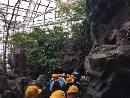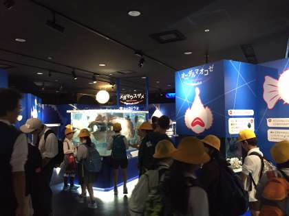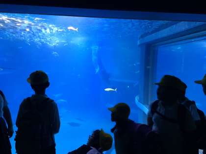 海遊館の中はたくさんの人でいっぱいでした。子どもたちは、グループで声をかけあい、きちんと並んで見学できました。