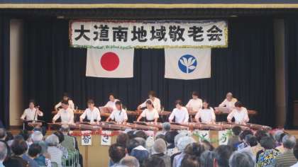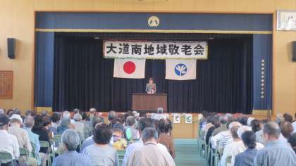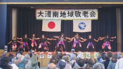 本日、大道南小学校講堂において大道南地域「敬老大会」が行われました。区長様に続き、校長先生もご祝辞を述べられました。地域のたくさんの方々がご出席され、ご長寿とご健康をお祝いされました。琴演奏や踊り、歌などが披露され、参加されたお年寄りの方々も本当に喜んでおられました。大道南小よさこい舞教室の子どもたちによる力強い「南中ソーラン」も披露され大きな拍手を受けていました。全校児童が作った敬老の日のプレゼントも渡されました。地域のお年寄りの皆様、お体にお気を付けいただいて、いつまでも健康でお元気にお過ごしくださいね。