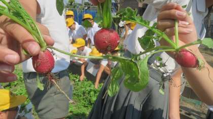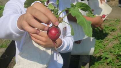ラディッシュはたねをまいて収穫までが短期間(20日前後)で、別名で二十日大根とも呼ばれるアブラナ科の野菜です。5年生が育てていたのを今日収穫しました。子どもたちは引き抜くまで大きさがわからないのでドキドキ。「うあー、ちっさーっ!」「うーん、まあまあかな」「おお、けっこうでっかい」…。感想を言いながら、子どもたちはうれしそうに引き抜いていきます。ラディッシュはサラダにしたりおひたしにしたり、とれたてフレッシュな状態で食べるととてもおいしいです。