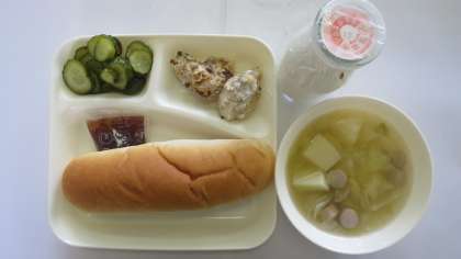 今日の給食のメニューは、鶏肉のマリネ焼き、スープ煮、きゅうりのピクルス、ジャム、牛乳、パン、でした。鶏肉のマリネ焼きはドレッシングでしっかりと下味がつけられていて、鶏肉は少し焦げ目もついており中はやわらかかったです。ドレッシングはノンエッグなのですがマヨネーズ風に仕上がっていました。スープ煮はあっさりとしたチキンスープで飲みやすく、じゃがいもはやわらかくウインナーが食感にアクセントを与えていました。きゅうりのピクルスはワインビネガーの酸味がほのかに効いていて、みずみずしさも感じられました。
