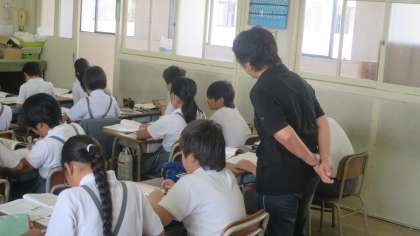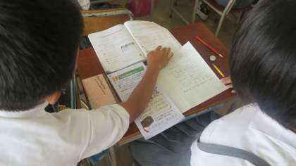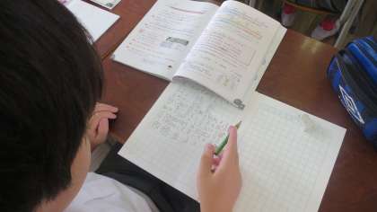 4年生が算数の授業で「四捨五入」の学習に取り組んでいました。子どもたちはボソボソ独り言のように言いながら練習問題に取り組んでいました。