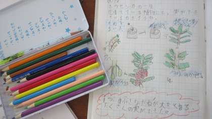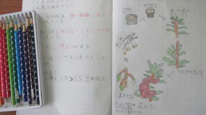 3年生が理科の授業でホウセンカの一生にについてまとめていました。色えんぴつを使って、ていねいに見やすくノートにかいていました。とても一生懸命にかいているのが伝わってきますね。