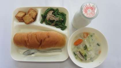 今日の給食のメニューは、はくさいのクリーム煮、あつあげのしょうゆだれかけ、豚肉と三度豆の炒めもの、牛乳、パン、でした。はくさいのクリーム煮は牛乳とクリームで深みのある味わいに仕上がっていて、白いスープにチンゲンサイの緑やにんじんのオレンジが映えてとても色鮮やかでした。あつあげのしょうゆだれかけはしょうゆだれが十分にあつあげにしみ込んでおいしかったです。豚肉と三度豆の炒めものは豚肉のうま味を生かした薄味の味付けとなっていました。ごちそうさまでした。