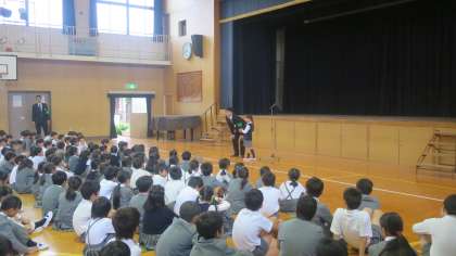 今日の児童朝会では東淀川警察署の生活安全課防犯係の警察官の方2名に来ていただきました。自分の身を守るために、安全に過ごすために、大切なことをお話していただきました。