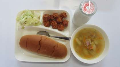 今日の給食のメニューは、まぐろのオーロラ煮、じゃがいものスープ、サワーキャベツ、牛乳、パンでした。まぐろのオーロラ煮はでんぷんでつけたとろみが甘辛いオーロラだれを吸い込んでまぐろを包み込み、下味でつけたしょうがの香りも効いていておいしかったです。じゃがいものスープはベーコンの塩気を感じつつ、全体的にはあっさりとした飲みやすいチキンスープに仕上がっていて、じゃがいももやわらかく口の中でとけていくようでした。サワーキャベツはほのかに甘酸っぱさを感じてさっぱりしていました。