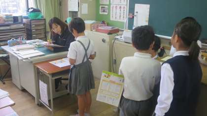 3年生がリコーダーのテストをしていました。先生の前に並んで自分の番を待ちます。少しドキドキです。ていねいにリコーダーの穴を指で押さえながら、リズムよく吹いていきます。うまく吹けない子には先生もやさしく声をかけます。「だいじょうぶだよ、ゆっくり落ち着いて、さあもう一回はじめから吹いてごらん」と言いながら手を添えて教えています。リコーダーは3年生から学習します。少しずつ上手になってきて、子どもたちもうれしそうでした。