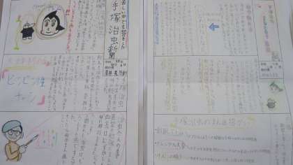 5年生が先日、遠足で行った手塚治虫記念館で学習したことや改めて知ったこと、思ったことなどを記事にして新聞づくりをしていました。小さな字でできるだけたくさんの記事をのせようとがんばっていました。子どもたちの描いたイラストもかわいらしいですね。