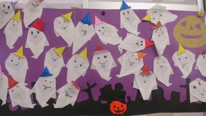 1年生の教室に小さな、かわいらしいハロウィンの掲示物が貼ってありました。画用紙2枚程度の大きさです。白い紙をちょっと折っておばけの形にして…、本当にすぐにできてしまいます。これもまた一瞬で描けそうな顔がちょんちょんと描いてあります。なにげないことなのですが、ちょっとした手間と時間をかけて、子どもたちの作品を教室に飾っていくことって割とめんどくさくてむずかしいことなんですよね。(あっ、めんどくさいって言ってごめんなさい)でもこれを作っているときの子どもたちはきっと笑顔なんでしょうね。やっぱり手間をかけることは大切ですね。見てください。かわいい1年生おばけがぷかぷか浮いています。