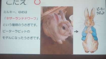 今日の児童集会は飼育委員会による発表でした。飼育委員会の仕事内容や世話をしているウサギについて発表していました。クイズ形式になっていて、○×クイズでみんな手をあげて楽しんでいました。ちなみに飼っているウサギの名前は「ミルキー」と「ゆめ」です。ネザーランドドワーフという種類のウサギでピーターラビットのモデルになったウサギらしいです。これも問題に出ていました。