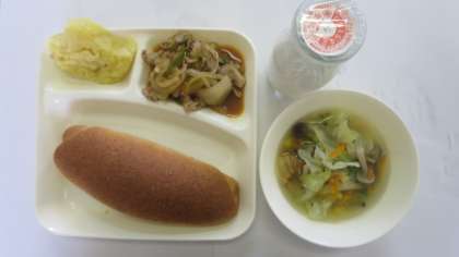 今日の給食のメニューは、豚肉と野菜のケチャップソテー、スープ、スイートポテト、牛乳、パン、でした。豚肉と野菜のケチャップソテーは甘みと酸味が生かされたケチャップソースが豚肉、ピーマン、たまねぎによくからんでいてとてもおいしかったです。スープは透明感があって細かくていねいに刻まれた具材が彩りよく、塩コショウがピリッと効いたチキンスープに仕上がっていました。スイートポテトはやわらかな口当たりで、上品な甘さでした。子どもたちもおいしいと喜んでいました。