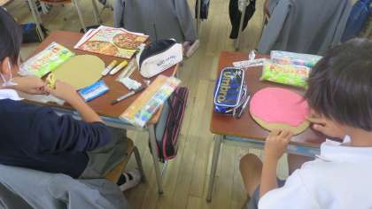 4年生の教室をのぞくとみんなの机の上にピザ屋さんのチラシが・・・。