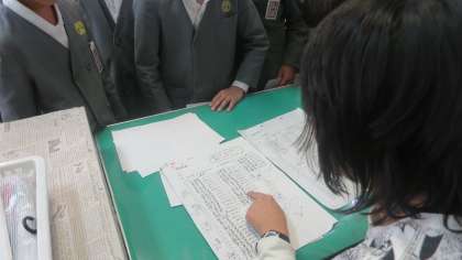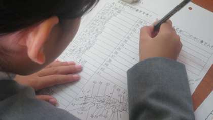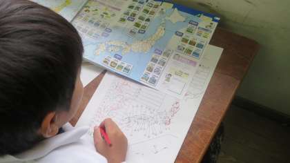 4年生が都道府県のテストにチャレンジです。さあ全問正解できるかな。「ぼく、けっこう自信あんねんなー。」「ちゃんと勉強してきたんやけど、えっ、ここ何県やったかなあ。」「やばいっ、どうしよう、全然わからん。」「漢字がわからん、とりあえずひらがなでいいか。」・・・、子どもたちの独り言が聞こえてきます。さあ、できた人から先生の前に並びます。ついつい友だちの結果をのぞき込んでしまいます。ドキドキ。先生が軽快に○をつけていきます。「よし100点や!」「うわっ、おしい!」「げっ、やりなおしいっぱい」・・・。「さあ、みんな、しっかりとやりなおしをしなさいよ」と先生の一見やさしそうな厳しいお声・・・。