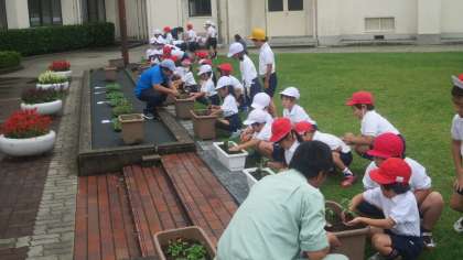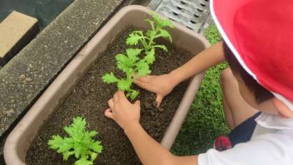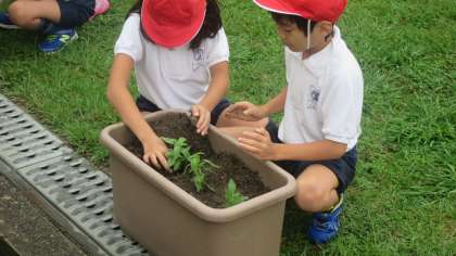 1年生がみんなで花の苗を植えました。植えた花の苗はパンジー、ビオラ、キンギョソウ、ノースポールです。