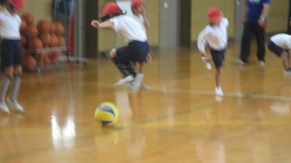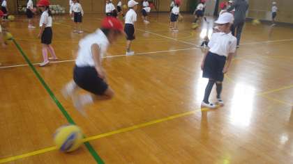 1年生が体育の授業でボールを転がして遊んでいました。転がってきたボールを上手によけたり、ジャンプしてかわしたりしていました。うまくタイミングをはかって「せーのーで、えいっ」ばっちりです。転がすほうもていねいに両手でそっと転がしてあげます。「○○ちゃん、いくよー」とても楽しそうでした。