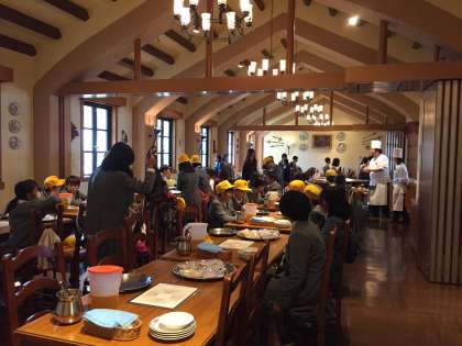 みんな元気で今からパエリアを作ります。テーブルの上には材料が並んでいて、子どもたちはワクワク、目を輝かせています。