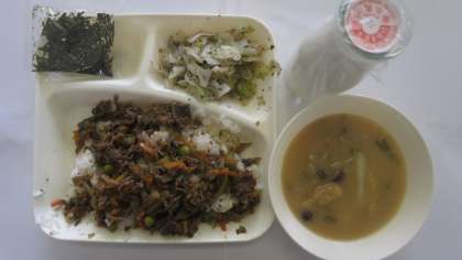 今日の給食のメニューは、牛肉のきんぴらちらし、みそ汁、キャベツの赤じそあえ、きざみのり、牛乳、でした。牛肉のきんぴらちらしはごぼうはちょうどよいかたさのささがきで、全体に濃い甘めの味付けでしっかりと酢が効いていました。ごはんと合わせると濃さがやわらぎ、おいしいきんぴらちらしずしになりました。みそ汁はだしがしっかりととられていて、うすあげやじゃがいも、しめじが入ってとてもやさしい味でした。キャベツの赤じそあえは赤じその風味が感じられ、さっぱりとしていました。