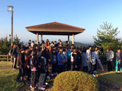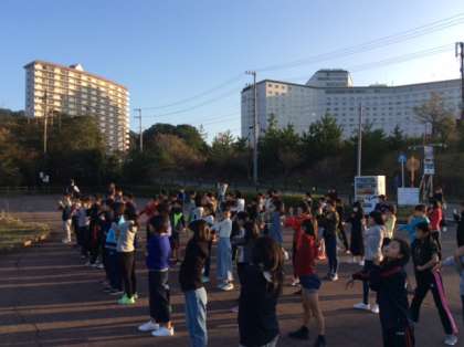 2日目の朝一番の活動は、ホテルをバックにストレッチをしました。その後的矢湾大橋や海の様子を見て、ホテルに戻り、朝食タイムです。