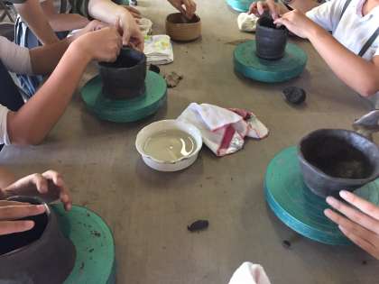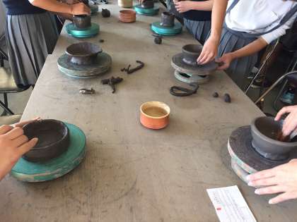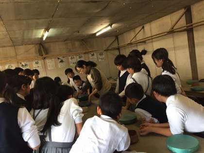 信楽での陶芸体験が始まりました。説明を聞いた後、それぞれが作りたいお皿や湯飲みやお茶碗を作っています。みんな真剣です。できあがったものは、丁寧に焼いていただいて、学校に届く予定です。できあがりが楽しみです。