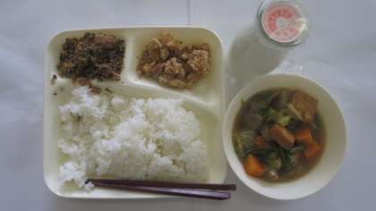 今日の給食のメニューは、鶏肉の竜田揚げ、厚揚げの野菜の煮物、おかか菜っ葉、牛乳、ごはん、でした。鶏肉の竜田揚げはしょうがじょうゆの下味がしっかりとついていて、ころももカラッと揚がっており肉はやわらかくおいしかったです。厚揚げと野菜の煮物は和風しょうゆだしとしいたけの風味が効いていて、ごぼうがやわらかく三度豆の食感も楽しむことができました。おかかなっ葉はだいこん葉といりごまが香りよく炒められていて、ごはんとの相性もばっちりでした。