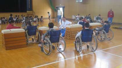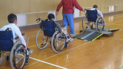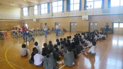 今日は大阪市立心身障がい者リハビリテーションセンターの方々に来ていただきました。3年生に対して「車いす体験講習会」を開いてもらいました。普段、車いすはよく見かけますが、自分が乗ったり押したりした体験はほとんどの子がありません。はじめに車いすの準備や乗り方、動かし方、注意することなどについて教えてもらいました。ブレーキがかかっていることを確認してから、まず一人で乗って動かしてみます。「思った以上にむずかしい」「うまく曲がれない」「小さな段差でも動けなくなる」「スロープは力がいる」「幅がせまいところは通りにくい」・・・、どんなところが大変か、気づいたことなどが思わず口に出てしまいます。車いすに乗っている人の気持ちが少しわかりました。