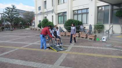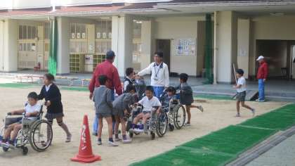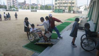 後半は友だちを車いすに乗せて押す体験をしました。一人で押すのが難しい段差やスロープのときは、まわりのみんなで手伝います。大切なことは乗っている人を不安な気持ちにさせないことと教わりました。「今から動くよ」「右にまがるよ」「段差があるよ」…、などの声をかならずかけてあげるように言われたので、子どもたちも真似をして声をかけていました。子どもたちは今日の体験を通して、ちょっとした心遣いや思いやりの気持ちをもつことの大切さに気づくことができました。
