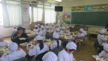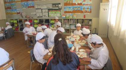 今日は交流給食の日です。ちがう学年の友だちとなかよく交流しながら給食を食べます。1年生と6年生、2年生と4年生、3年生と5年生、そして普段職員室で食べている先生たちも教室に入って一緒に食べました。いつもとちがった雰囲気で、はじめは緊張気味だった子もいたようですが、みんなすぐにうちとけていきました。やっぱり1年生と6年生がとなりどうしですわると小学校6年間での成長のあとがうかがえますね。