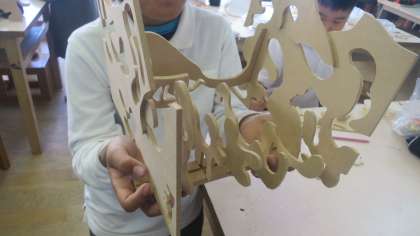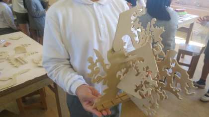 5年生が図画工作科で電動糸のこぎりを使って工作にチャレンジしています。思いのままに手を動かして・・・自由に組み合わせて・・・、なんだかものすごい作品ができあがってきました。十分家に飾れる置き物になりそうです。作品のなまえはあるのか聞いてみると「・・・・・・。」作った本人もわからないみたいです。でもなかなかどうして、立派な作品に思いませんか。色もぬったりするのかな。