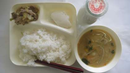 今日の給食のメニューは、豚肉とまいたけの炒めもの、つみれ汁、ういろう、牛乳、ごはん、でした。豚肉とまいたけのいためものは豚肉とキャベツの甘みがしょうゆだしと合わさり、ごはんにとてもよく合う味付けでした。まいたけのやわらかい食感も楽しめました。つみれ汁はごぼう、にんじん、だいこんが細かく刻まれていて、だしがしっかりととられたみそ汁にいわしだんごの風味が漂っていました。ういろうはほのかに甘さが感じられ、もちもちしていておいしかったです。