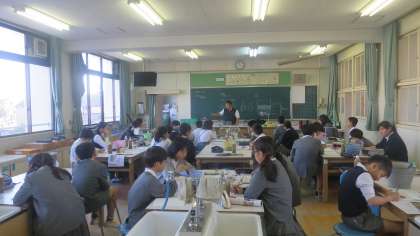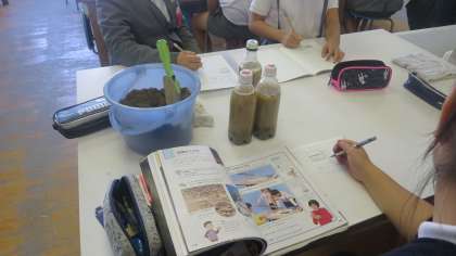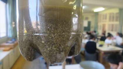 6年生が理科の学習で地層をつくる簡単な実験をしていました。学校内のいろんな箇所の砂や土を集めてきてペットボトルの中に水といっしょに入れてシェイクします。ふりふり…ふりふり…、しばらくそのままにしておくと重いものから沈殿していきます。写真ではわかりにくいですがペットボトルにいくつかの層ができています。一日たつともっとはっきりとクリアになっていきます。子どもたちは真剣な表情でペットボトルをのぞき込んでいました。