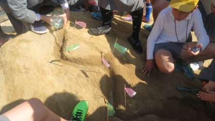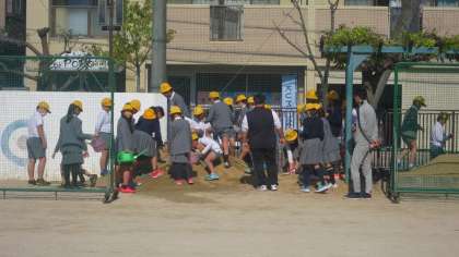運動場の砂山に5年生の子どもたちが集まっていました。のぞいてみると5年生が理科の授業で「流れる水のはたらき」の実験をしていました。「水の流れの速いところでは土がけずられてたで」「流れがゆるやかなところでは土が積もっていたよ」…。子どもたちは実験をしながら流れる水のはたらきについてよく観察していました。