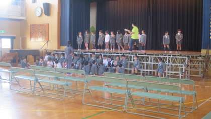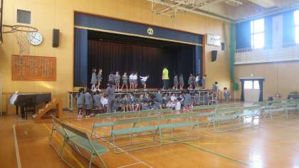 1年生が講堂で学習発表会に向けての練習をしていました。まず自分の立つ場所や移動の仕方を覚えようと頑張っていましたが、なかなかスムーズにはいかないみたいです。先生が「○○さんはこっちだよ」「そっちじゃなくてここから下りていきます」「後ろの人はちゃんとついてこないと…」先生も大変そうですが、子どもたちも慣れてくるとスムーズに動けると思います。他にもセリフや振り付け、歌などもあると思います。講堂での練習はどの学年も始まったばかりです。あせらずゆっくり練習していきます。