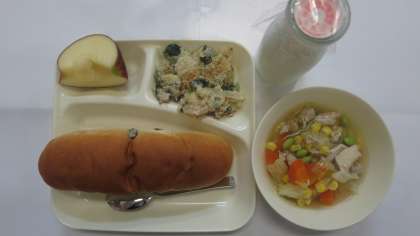今日の給食のメニューは、スープ煮、ほうれん草のグラタン、りんご、牛乳、パン、でした。スープ煮はコクのあるチキンスープに色とりどりの具材がちりばめられていて見た目にも楽しむことができました。鶏肉はワインで下味がつけられています。ほうれん草のグラタンは手作りのまろやかなグラタンソースがほうれん草やマカロニをやさしく包み込んでいました。焦げ目がちょうどよい感じでついていて香ばしさも味わえました。りんごは果汁が多く甘かったです。
