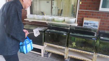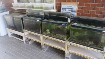 正面玄関入口付近に水そうがならんでいるのをみなさんご存知でしょうか。淀川に住んでいる魚を中心に数種類の魚たちが泳いでいます。実はいつも地域の方がお世話をしてくれています。ときどきようすを見に来ていただいたり、えさをあげていただいたり…。子どもたちもどんな魚がいるのかとよくのぞき込んでいます。