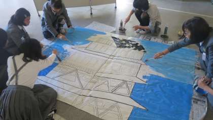 6年生の数名の女子がろうかに新聞紙を広げて、その上で学習発表会で使用する背景の絵を描いていました。まるで舞台スタッフの大道具さんのようですね。聞いたところ他にも作るものがあるみたいです。みんな和気あいあいとしゃべりながら、楽しそうに作業を進めていました。