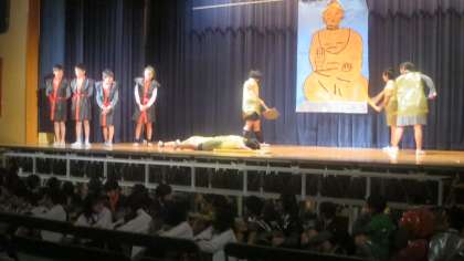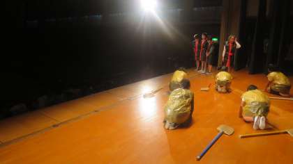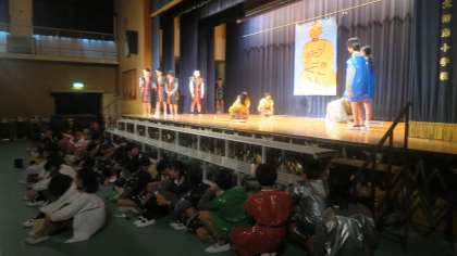 学習発表会に向けて6年生が練習をしていました。衣装も着けて小道具も用意して、リハーサル形式で望みます。もちろん音響も合わせていきます。うまくできるか少し緊張気味の子もいました。スポットライトが当たるとついあせって早口になってしまいます。今から少しずつ調整していきます。きっとよい作品に仕上がると思います。