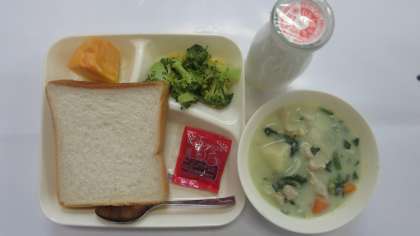 今日の給食のメニューは、ほたて貝のクリームシチュー、ブロッコリーとコーンのサラダ、かき、ジャム、牛乳、パン、でした。ほたて貝のクリームシチューはほたての風味が生かされていて、まろやかでクリーミーに仕上げられた手作りのルウがやわらかく煮られたじゃがいもやにんじん、鶏肉などをやさしく包み込んでいました。ブロッコリーとコーンのサラダはオリーブ油としょうゆで作られたドレッシングで和えられていて、コーンの甘みも感じられました。かきはそれほど固くなく甘みがありました。おいしかったです。