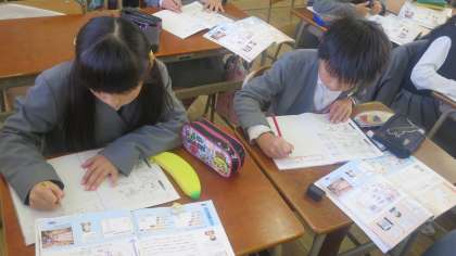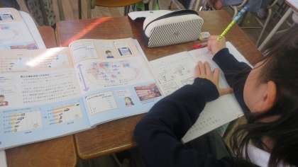 5年生が社会の授業で日本の貿易について学習していました。日本の輸入や輸出の特徴についても調べていました。