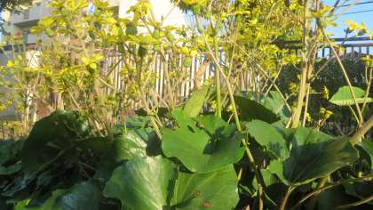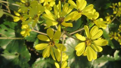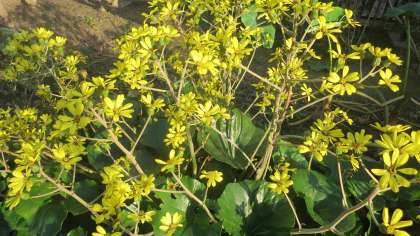 つやのある大きな葉をもっており、毎年秋から冬にかけてキクに似た黄色い花をまとめて咲かせます。「ツワブキ」という名前については艶葉蕗(つやはぶき)、つまり「艶のある葉をもったフキ」から転じてなったという説もあります。フキと同じように葉柄は食用にもなるそうです。
