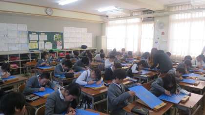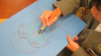 6年生が図画工作科の学習で版画に取り組んでいました。まだ下描きの状態で、今日から彫り始めたとのことです。どうやら自画像のようですね。彫刻刀の刃はするどいので気をつけてほしいです。先生も「彫刻刀の前に手をおかないっ!」と何度も指導していました。