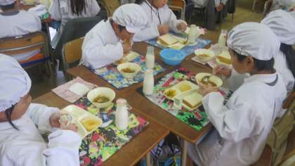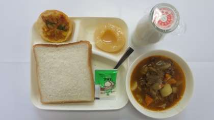 今日の給食のメニューは、牛肉のケチャップ煮、変わりピザ、白桃、マーガリン、牛乳、パン、でした。牛肉のケチャップ煮は牛肉の旨みが感じられ、具材もていねいに刻まれてやわらかく煮られており、上品でコクのある洋風スープに仕上がっていました。変わりピザはツナやチーズ、ピザソースなどが混ざり合って濃厚な味わいとなり、ギョウザの皮がパリッとした食感でおいしかったです。白桃は児童にもとても人気があります。