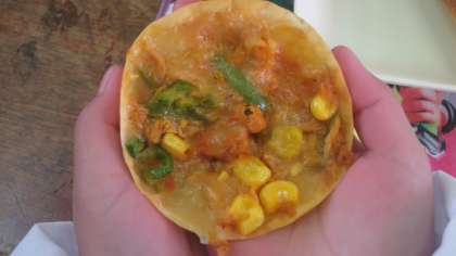 変わりピザはツナ、コーン、ピーマン、ピザソース、チーズを混ぜ合わせたものをギョウザの皮にぬって、約200度で5分間焼き物機で焼きます。ものすごく手間がかかっているので、本当は2〜3枚食べたいところですが一人1枚です。残念(泣)