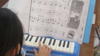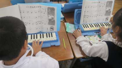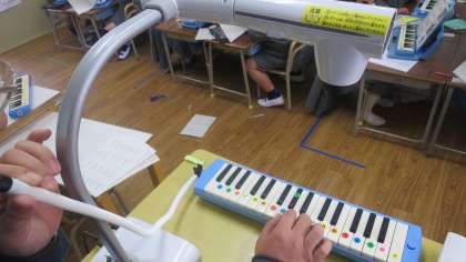 1年生が音楽の授業で「けんばんハーモニカ」の練習をしていました。まず先生が自分の指使いを手元のカメラに映して、それを黒板にプロジェクターで表示します。これで子どもたちは実際の指の動きを同時に見ることができて、一斉に練習したり確認したりすることが簡単にできます。すると練習する時間が長く取れて能率的ですね。今日は「サンタクロース」という曲を練習していました。上手な友だちが見本で演奏した後には、みんなで大きな拍手をしていました。