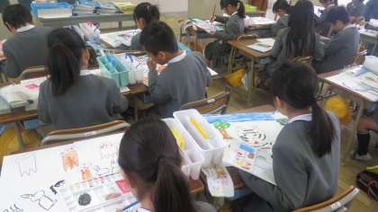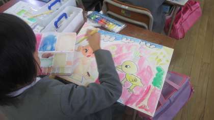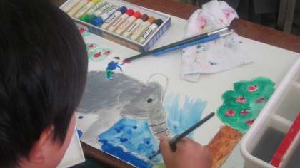 子どもたちは少しずつえのぐをまぜながら自分のぬりたい色を作って、楽しそうに絵を描いていましたよ。ちなみに絵のテーマは「どうぶつさんとわたし」だそうです。掲示されたらまた紹介しますね。