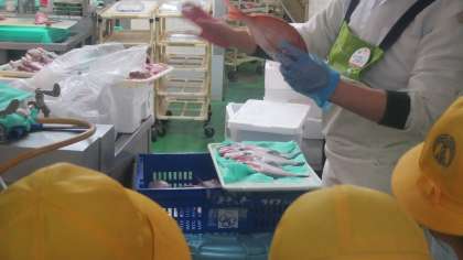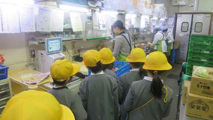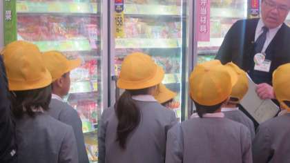 スーパーの入口付近には季節の物や旬の物、そして色とりどりの野菜や果物をならべて華やかな感じになるように工夫しているそうです。子どもたちは説明を聞いて「なるほど」とうなずいていました。そしてバックヤードにも入れていただきました。バックヤードとは商品を貯蔵、保存していたり、商品をラップ、テープ止めをしたり、野菜・魚・肉を加工したりしているところです。普通のお客さんは入れません。もちろん衛生的な問題があるので少し離れたところから見学するのですが、働いている方も気さくに話しかけて子どもたちに仕事内容について教えてくれました。店長さんも直々に子どもたちを案内してくれたり質問に答えてくれたりしていました。本当にお世話になりました。ありがとうございました。