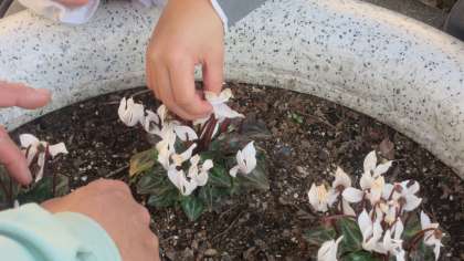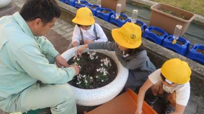 管理作業員さんが花の手入れをしているところに低学年の子が・・・。