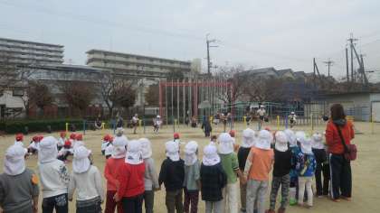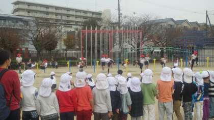大桐保育園のおともだちが学校見学にやってきました。どの子も小さくてとてもかわいらしいです。3年生の体育を見学しているところです。突然の訪問に3年生のお兄ちゃんお姉ちゃんはちょっと緊張気味。かっこいいとこ見せないと・・・。