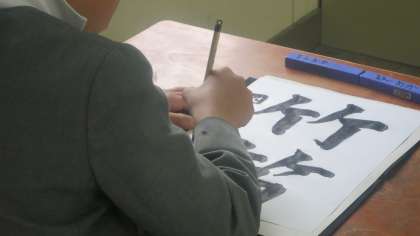 4年生が習字(毛筆)をしていました。練習する字が少しずつむずかしくなってきます。今日のお題は・・・「竹笛」。なんともむずかしい。これは子どもたちも悪戦苦闘ですね。注意するポイントや字のバランスなど、木をつけることがたくさんありそうです。子どもたちも一筆一筆気が抜けません。