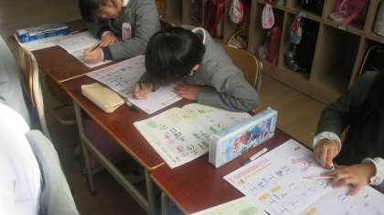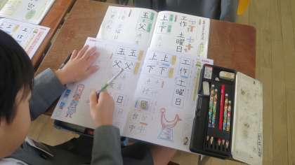 2年生が書き方ノートを使って、字の練習をしていました。気をつけることは「画と画がつくところや交わるところに気をつけて書こう」です。子どもたちは画がつくところや交わるところになるとえんぴつを動かす速さをゆっくりにして、ていねいに書いていました。2年生になると1年生のときよりもえんぴつをもつ力も強くなって、しっかりとした筆圧で力強い字が書けるようになってきました。