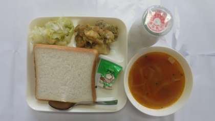 今日の給食のメニューは、鶏肉のカレー風味焼き、ミネストローネ、サワーキャベツ、マーガリン、牛乳、パン、でした。鶏肉のカレー風味焼きはにんにくとカレー粉の風味がしっかりと下味につけられていて、鶏肉には焼き目もあり身はやわらかく上手に焼かれていました。ミネストローネはたまねぎの甘みとトマトの酸味が生かされて深みのある味わいとなっていました。サワーキャベツはさっぱりとした口あたりでした。おいしかったです。